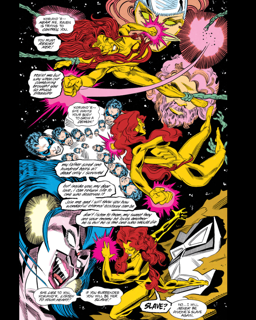 Artfully arranged hair strategically covers Starfire’s figure, yet still allows for her completely nude body to be visible. One of the more important factors to consider in this panel is that it takes place inside Starfire’s consciousness, but her physical body is clothed in the following panels. Her nudity is most likely supposed to be considered metaphorically representative of being unburdened and free of societal standards, while the social hierarchy of her planet actually defines much of the characters backstory. Starfire’s body is bound by vines that then shift towards more traditional alien hands, reminiscent of previous designs of the species that once enslaved her. She breaks free after hearing Grayson telling her that the intent of the demon is to enslave her. While it is hard to differentiate between the two sets of dialogue not directly attributed to a character, as seen on Starfire in the lower right-hand corner, there is subtle differences in the font between Grayson and the demon that would have been more noticeable in the original printing. They have lost some definition in the digitization process. Starfire does not free herself from this violation but is coaxed into doing so by Dick Grayson, a male hero.