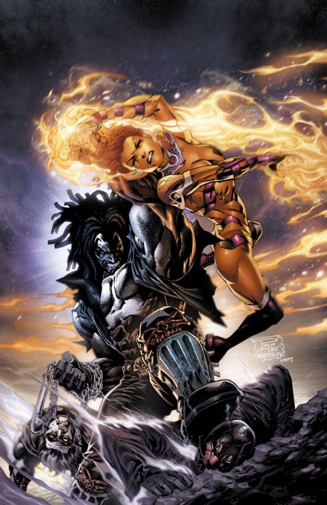 Once again, a female hero is at the mercy of a male character and not just battling for the safety of the team. In both the previous header and this image, Starfire is using the same powers. While the 2003 Teen Titans version above is targeted toward a younger audience, there is a massive and drastic difference between the character design. This drastic difference in sexualization is clearly intentional and done to such a degree that leaves the characters nearly unrecognizable as the same character. This version of Starfire finds her body once again on display in a bound position. The neckline of her very limited costume collars her, while the tape-like strips of fabric replace her hair in covering the essential parts of her body. Her body is placed into a curved position, focusing the attention to her chest, hips, and buttocks.