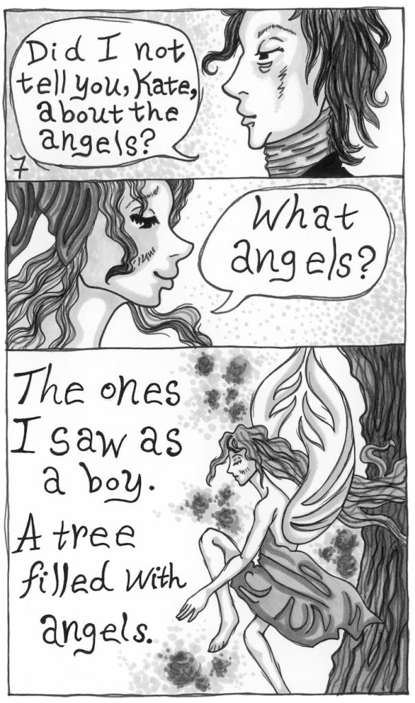 The art style is haunting and reminiscent of Tim Burton’s work. The thick dark lines and broad strokes create the feelings of discontent and unsettledness that flow in the undercurrents of Blake’s poetry. Following Blake’s real-life melancholia and manic states and his fascination with religion, The Poet and The Flea introduces the idea that Heaven and Hell were locked in a battle for Blake’s soul.